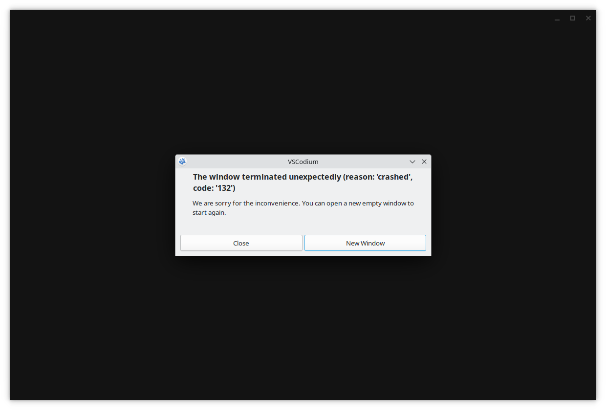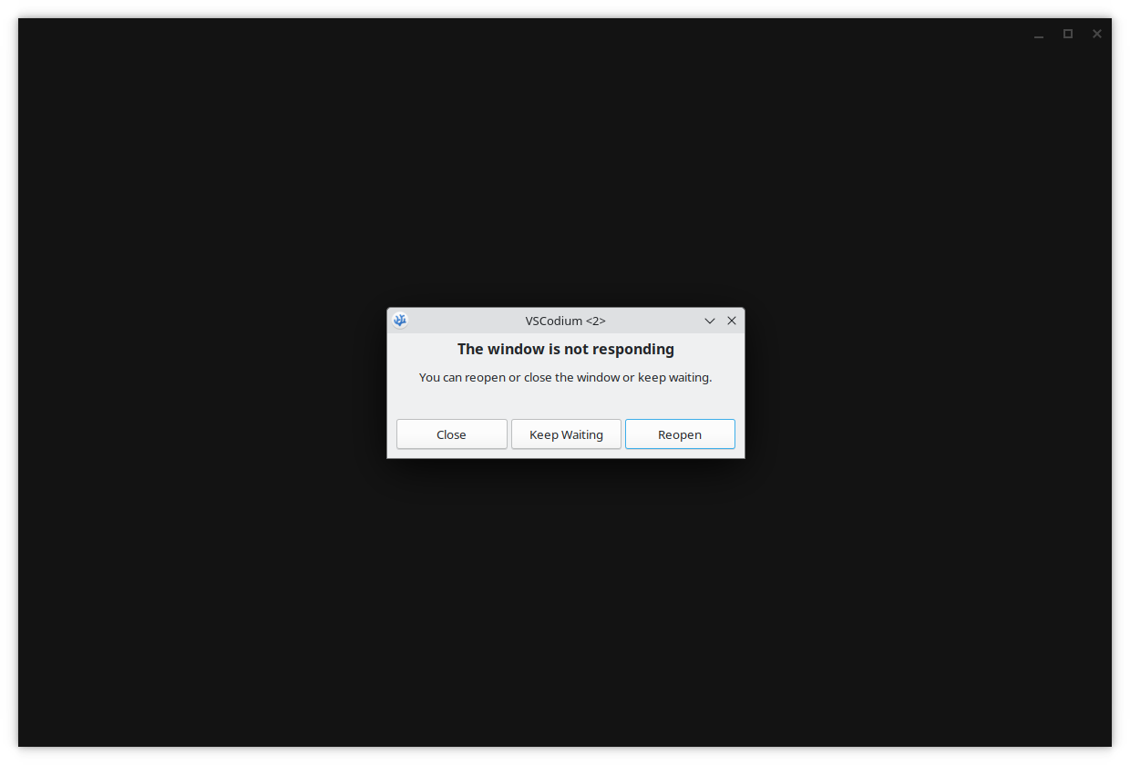 通过oma安装VSCodium后什么都没有做就直接打开VSCodium,结果除了一个全黑窗口什么都没有,之后过了一段时间会出现窗口没有响应的提示,点Keep Waiting后一段时间继续出现之前的提示,连续几次后会出现程序崩溃的提示,这次只能关闭或者打开新窗口。