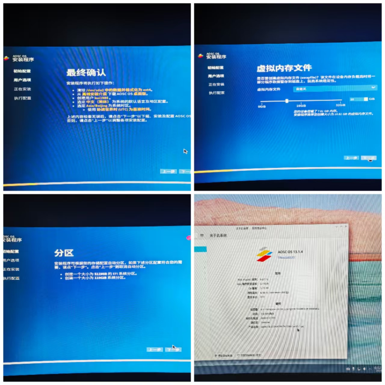 宁美品牌龙芯3A4000 LS3A4000-7A1000电脑,安装AOSC.2026.3.26发行的版本,安装好后重启电脑出现进不了系统的情况,用启动盘可以进入实试用版系统,也可以进入BLOS,取下启动盘就进不了BLOS,会黑屏没有反应。安装系统时启动1项,是USB,后改回硬盘为启动1项。还是不行。我把安截图发出来,麻烦论坛大佬些帮忙看看是哪里出了问题。